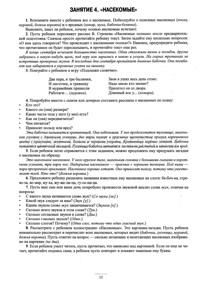 Тетрадь содержит 15 занятий, рассчитанных на неделю. Задания направлены на развитие связной речи, поддержание диалога, звуковой анализ слов, составление предложений и тренировку памяти. Также присутствуют пальчиковая гимнастика и подвижные упражнения.