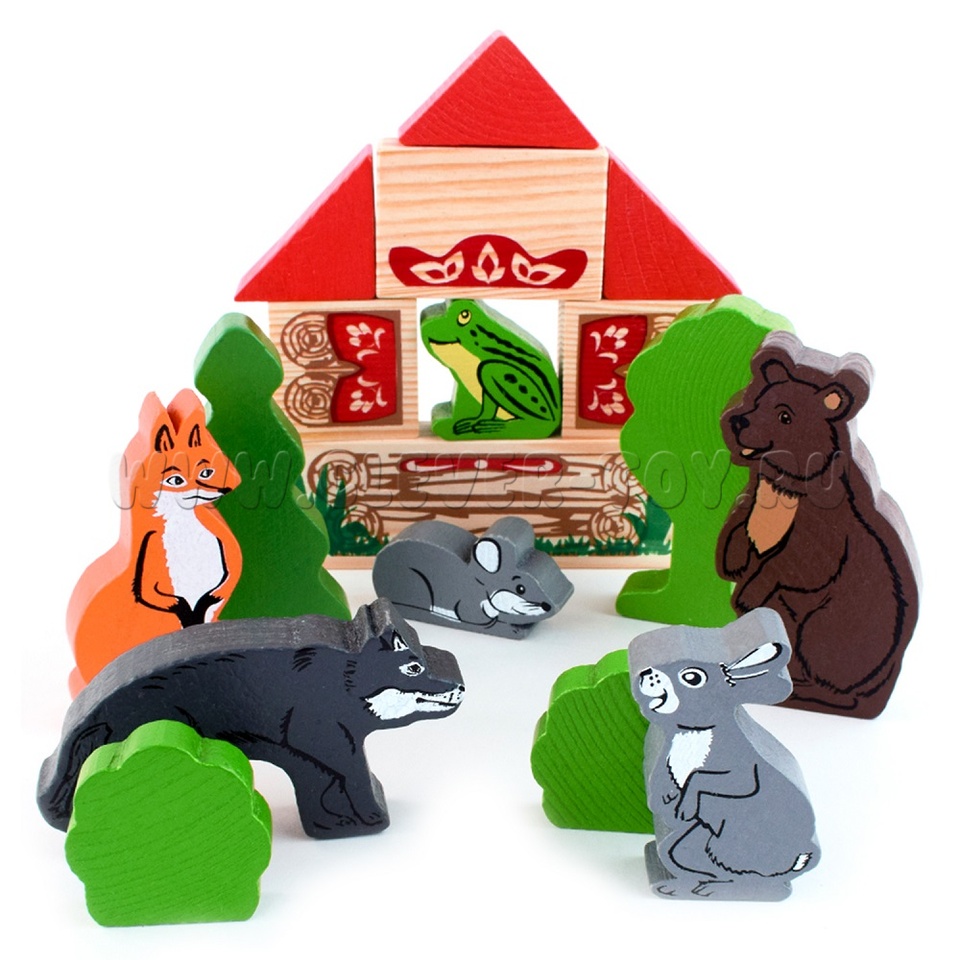 В набор входят деревянные модели персонажей и декорации сказки "Теремок" (всего 17 деталей).