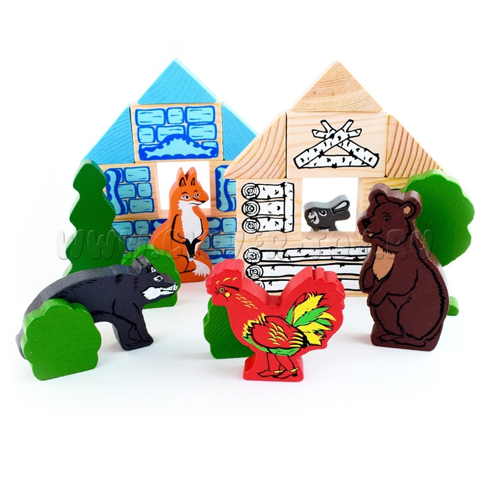 В набор входят деревянные модели персонажей и декорации сказки "Заюшкина избушка" (всего 24 детали), а также вкладыш с текстом сказки.