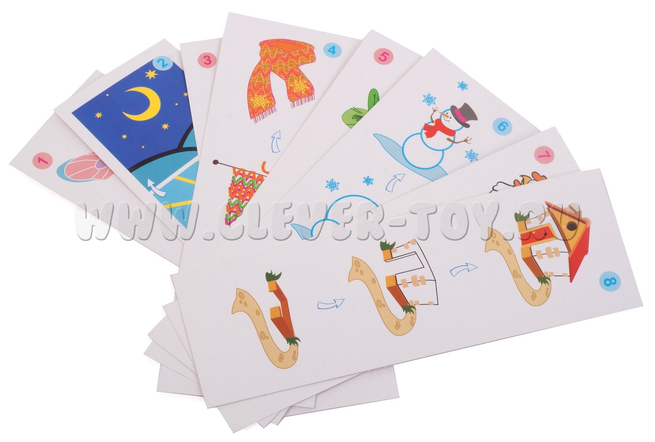 Цель игры: Необходимо найти и составить три кубика в точности с заданием, указанным в карточке-образце, то есть правильно воспроизвести последовательность события (действия) во времени.
