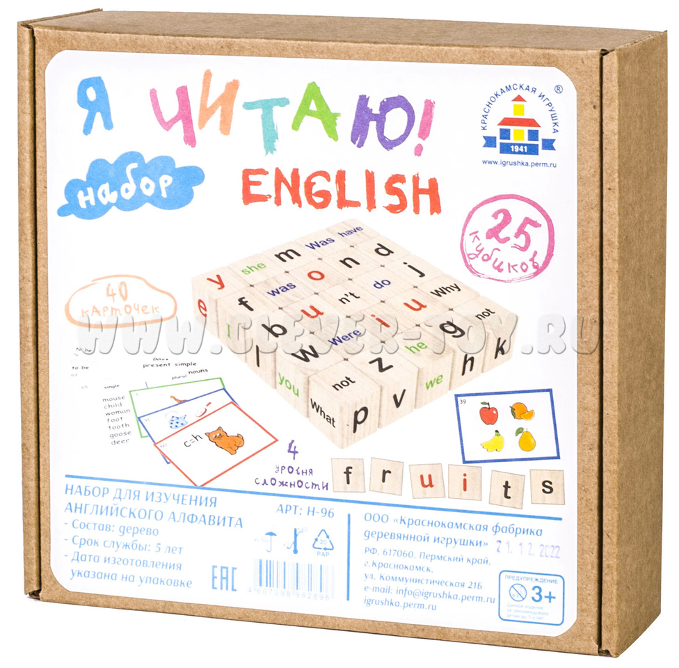 • 25 деревянных кубиков с буквами английского алфавита, сочетаниями букв, местоимениями, глаголами, отрицательными частицами, знаками препинания, вопросительными словами;