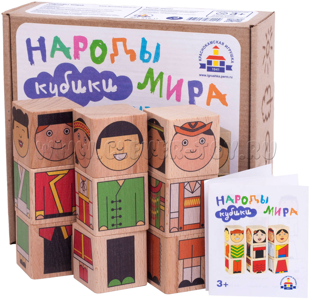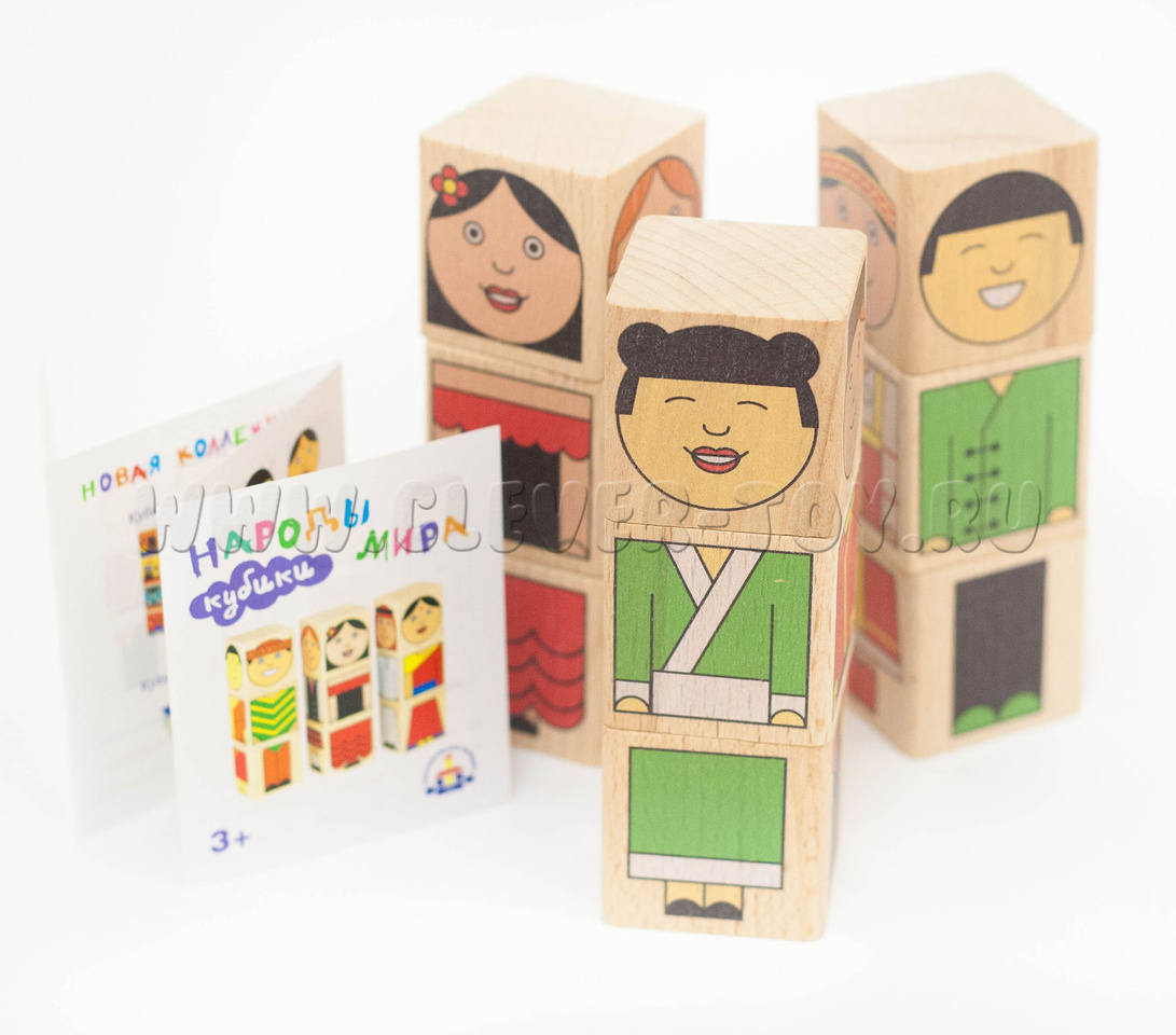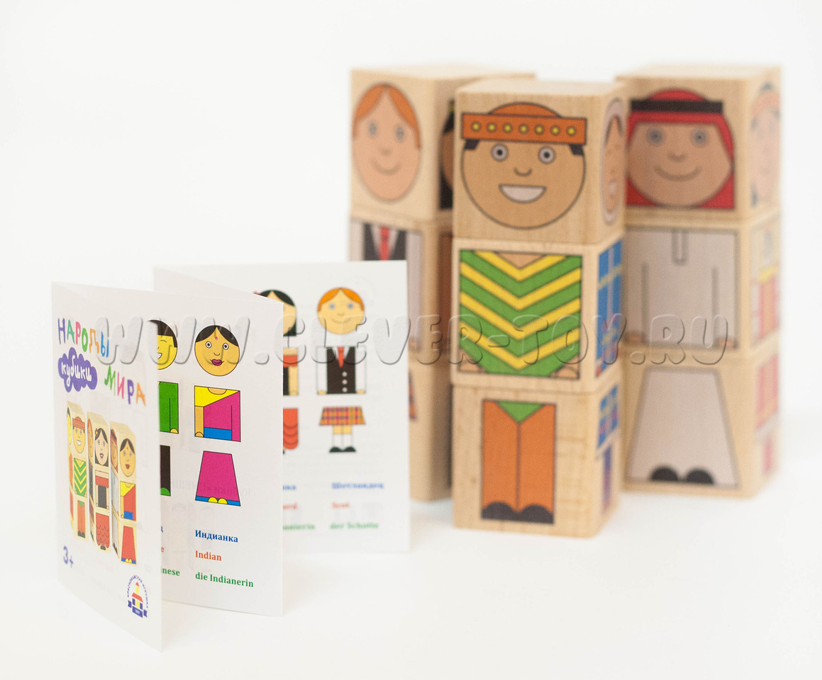 В комплект входит 9 деревянных кубиков. На 4-х гранях каждого кубика нанесена яркая картинка – часть тела забавных человечков разных национальностей. Картинки расположены таким образом, что можно ставить кубики друг на друга, чтобы получался вертикальный «кубический человечек».