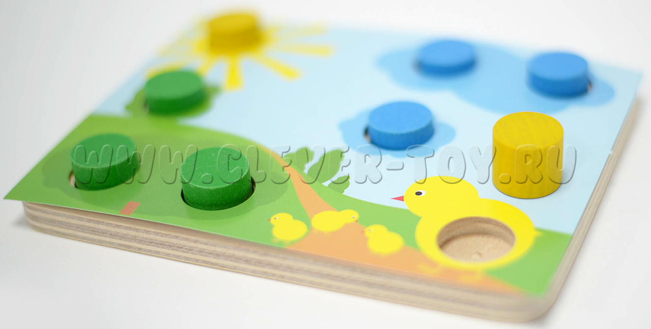• Установите карточки на поле, предложив ребёнку подобрать фишки-пеньки по цветам в соответствии с картинкой.