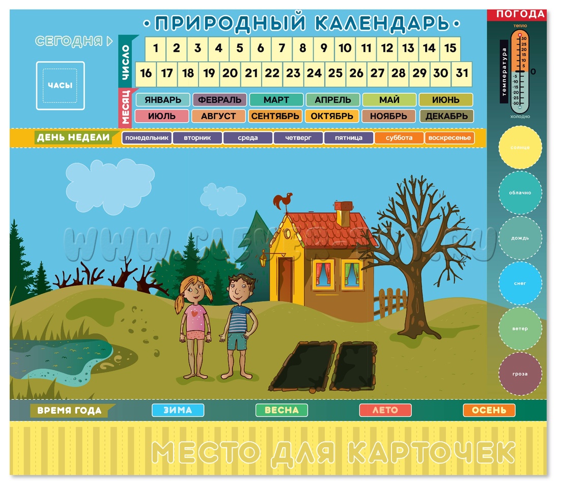 Дети с радостью будут использовать магнитные маркеры для обозначения времени года, месяца, дня недели, числа, часов и минут. Они также смогут указывать температуру на термометре и работать с карточками, которые представляют признаки весны, лета, осени или зимы.