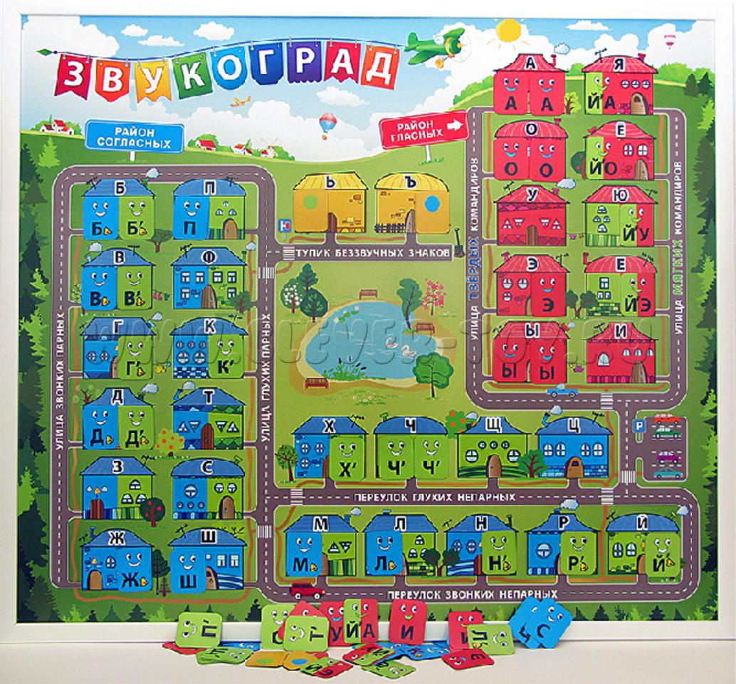 • 72 магнитных карточки  (5 см * 4 см.) С звуками и буквами.