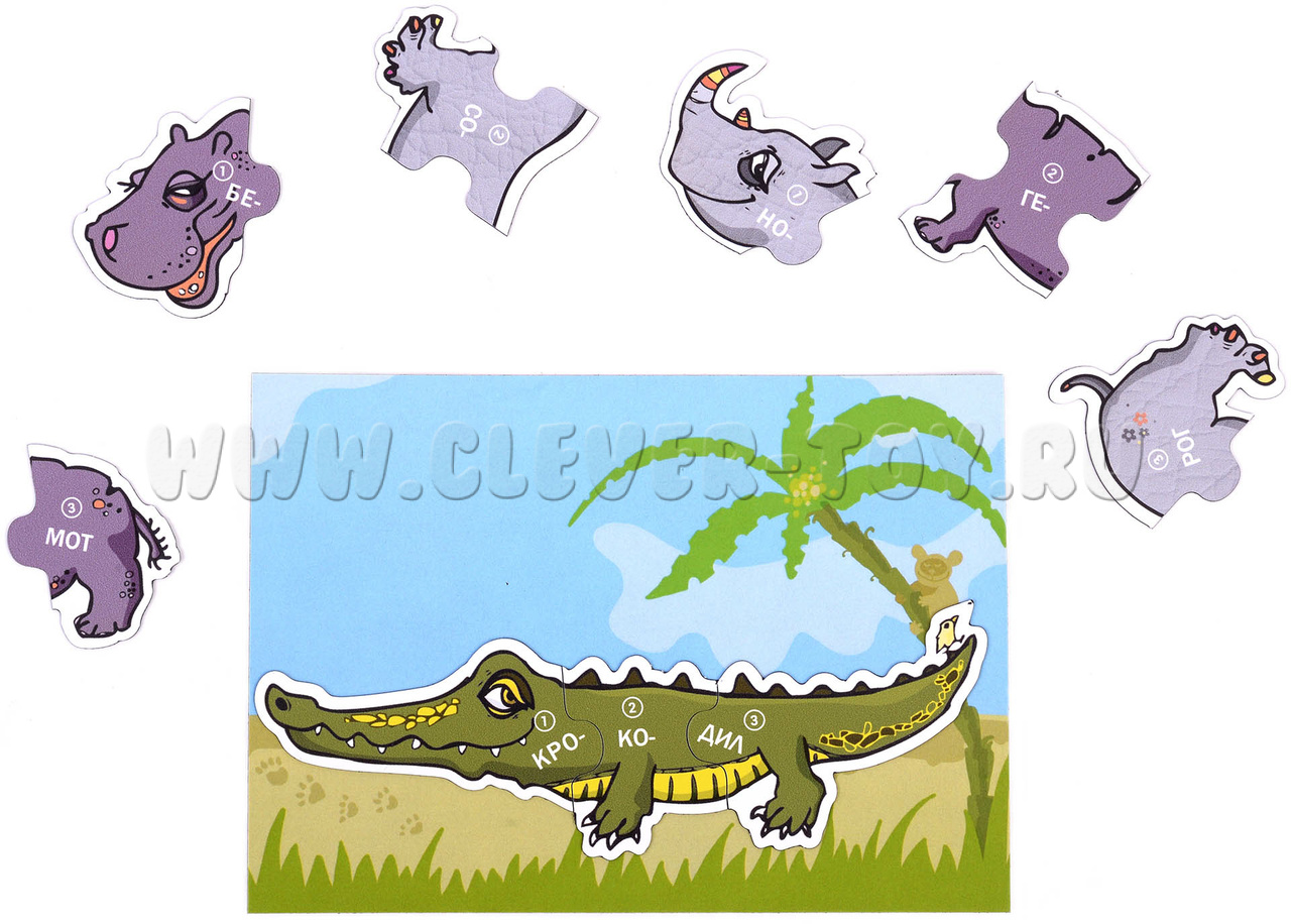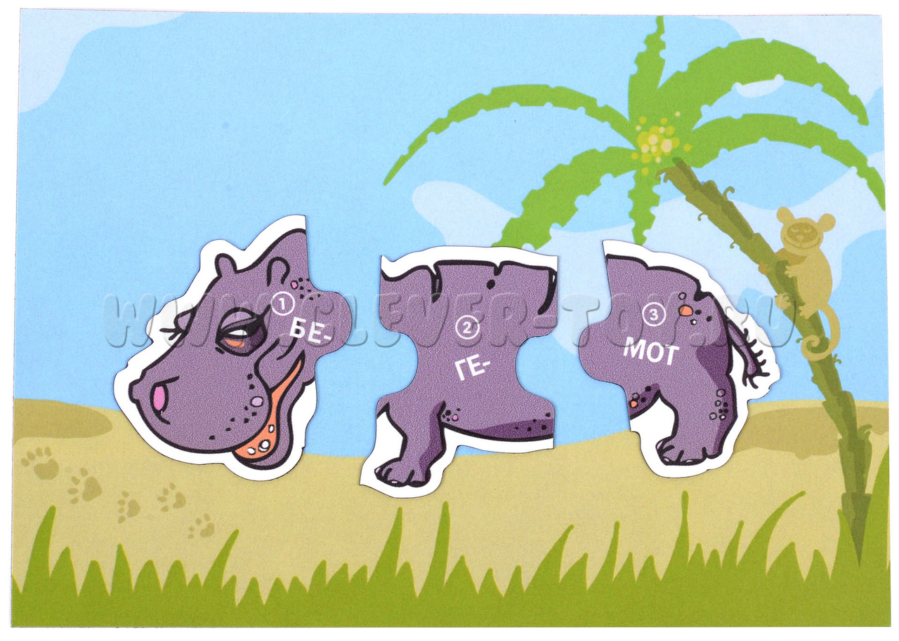 На поле нарисована жаркая Африка, в которой живут бегемот, крокодил, носорог. В нашем варианте каждый из них состоит из трех частей. Малыши должны правильно собрать этот забавный конструктор так, чтобы бегемот не был похож, допустим, на крокодила, а у носорога остался собственный, а не чужой хвост.