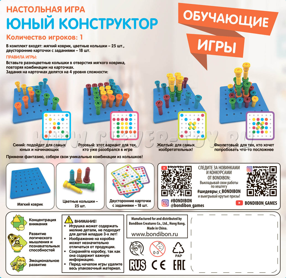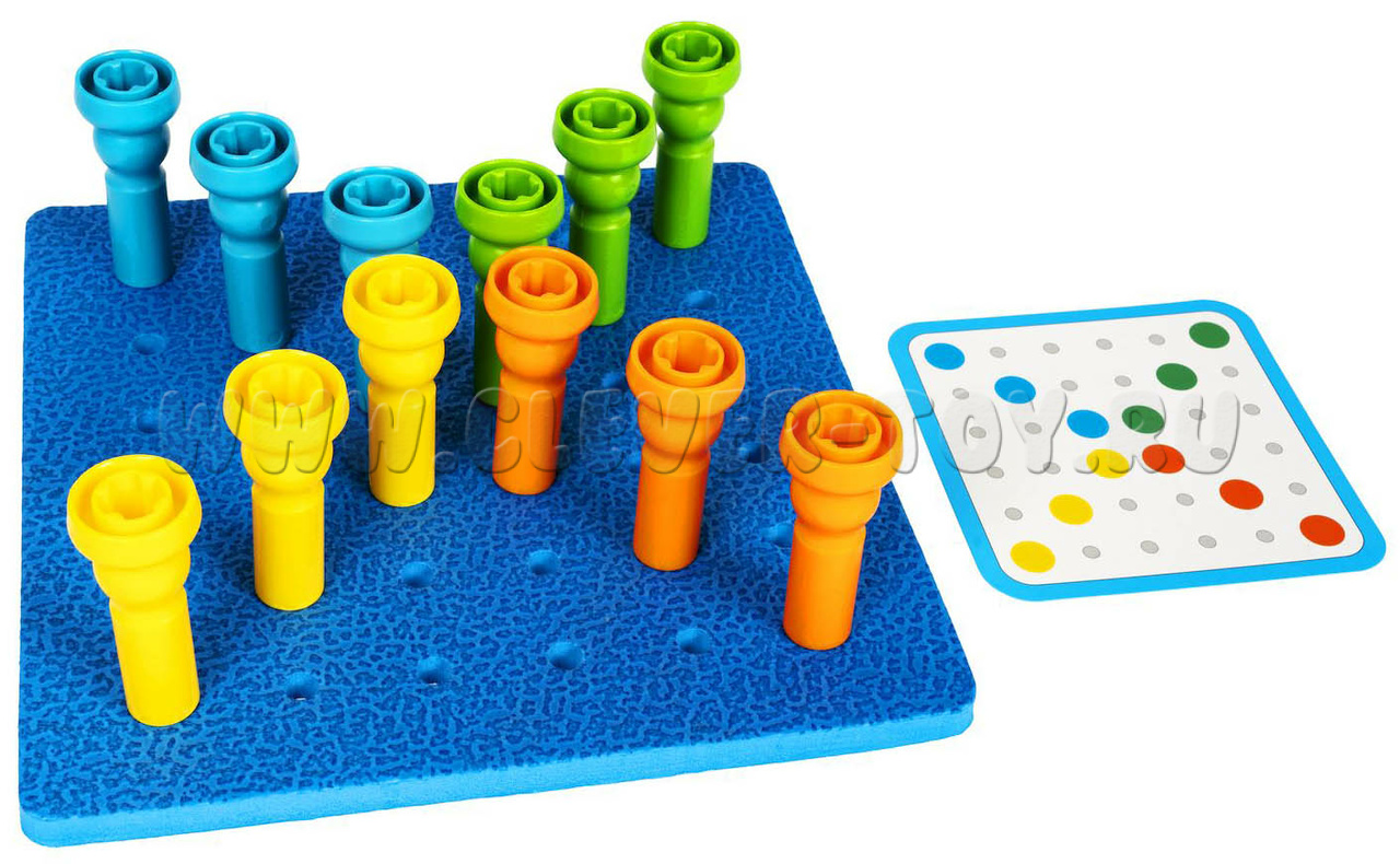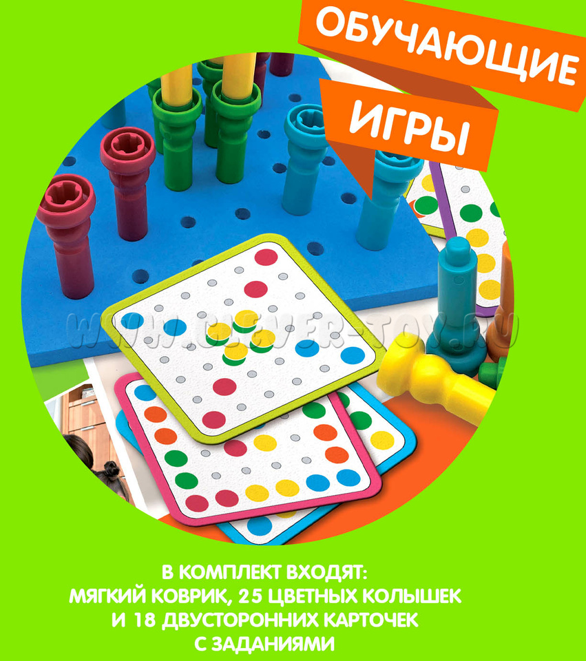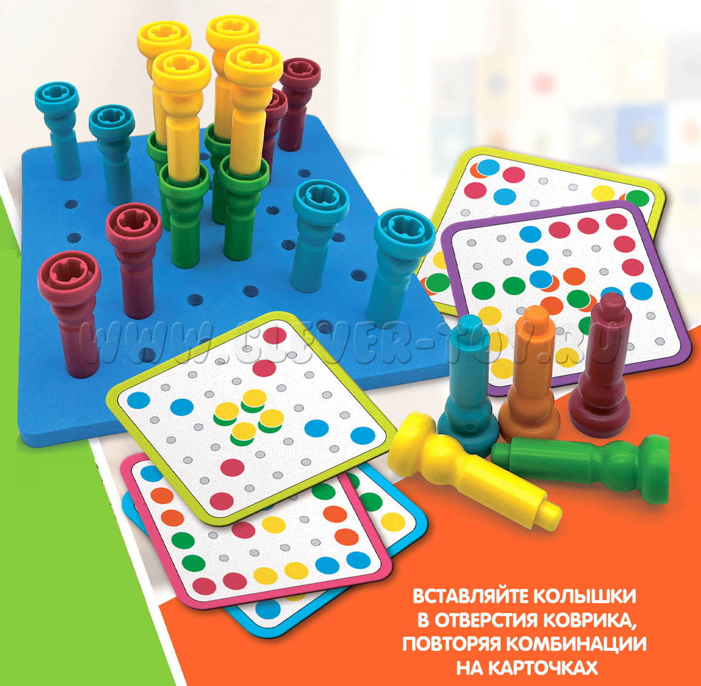 Вставляйте разноцветные колышки в отверстия мягкого коврика в соответствии комбинациям на карточках, либо придумывая свои узоры. 4 уровня сложности заданий.