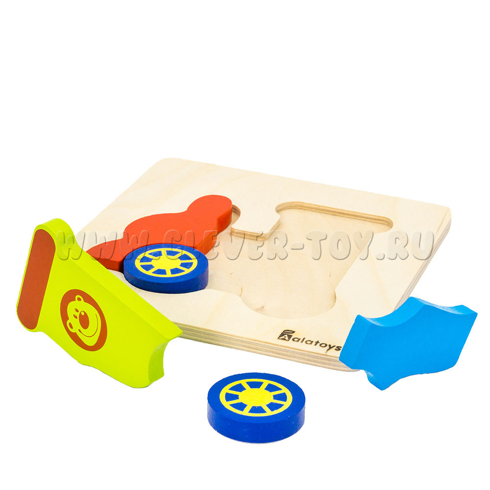 Пазл «Паровозик» представляет собой деревянную основу с углублениями для размещения деталей паровозика. Только правильно подобрав детали по форме и размеру, у ребёнка получится сложить правильные пазлы.