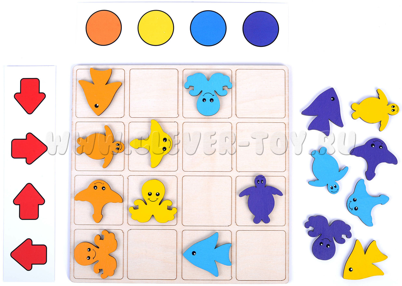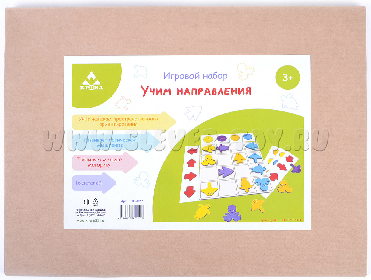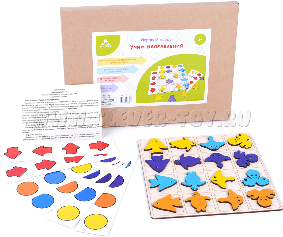 В набор входит: игровое поле 210*210 мм,фигурки животных 16 шт,карточки с заданиями двухсторонние 6шт. (8 вариантов игры с направлением и 16 вариантов с цветами),инструкция.
