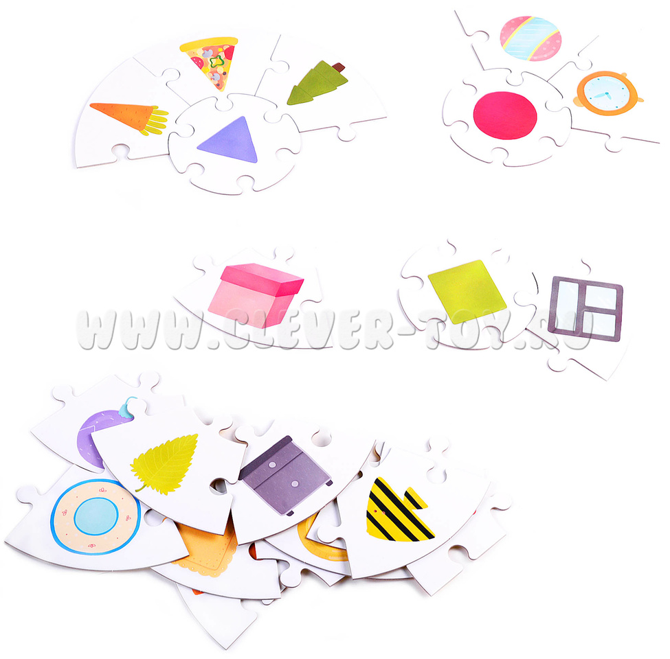 3. Игра на стороне с белым фоном в команде от 2 до 6 человек. Раздайте игрокам центральные части пазлов, перевернутые белой стороной вверх. Перемешайте остальные элементы и случайным образом выберите один из них, покажите играющим. Тот, у кого такая же фигура изображена на серединке, забирает элемент себе. Побеждает игрок, быстрее всех собравший полный круг.