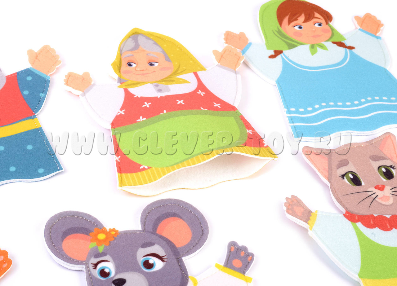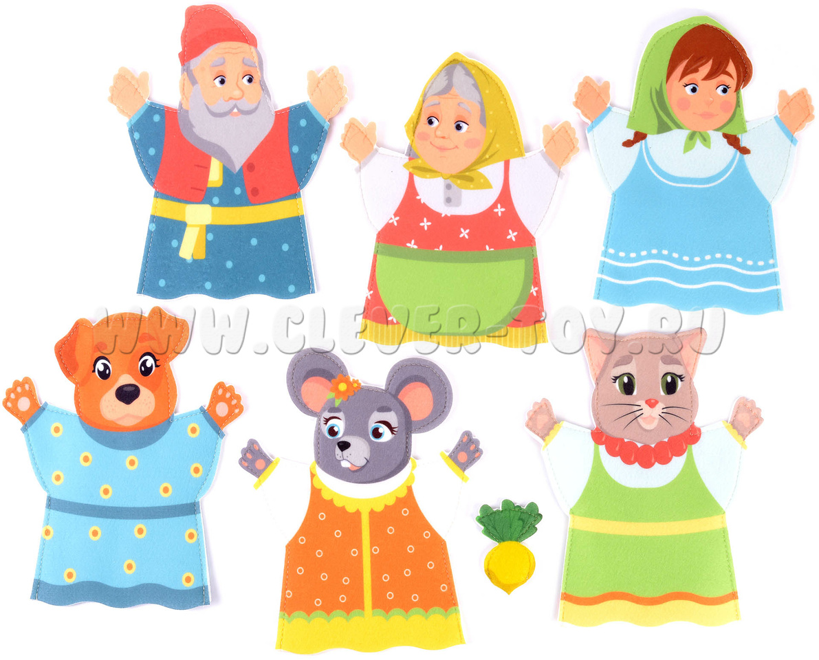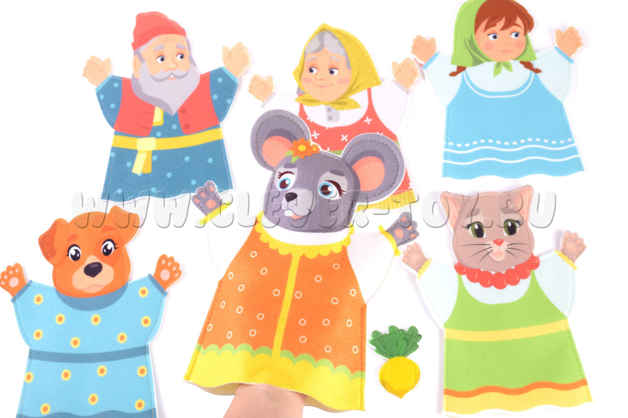 Шесть персонажей из сказки репка на руку 23 см. Бабка, дедка, внучка, собака, кошка, мышка + репка (пальчиковый театр).