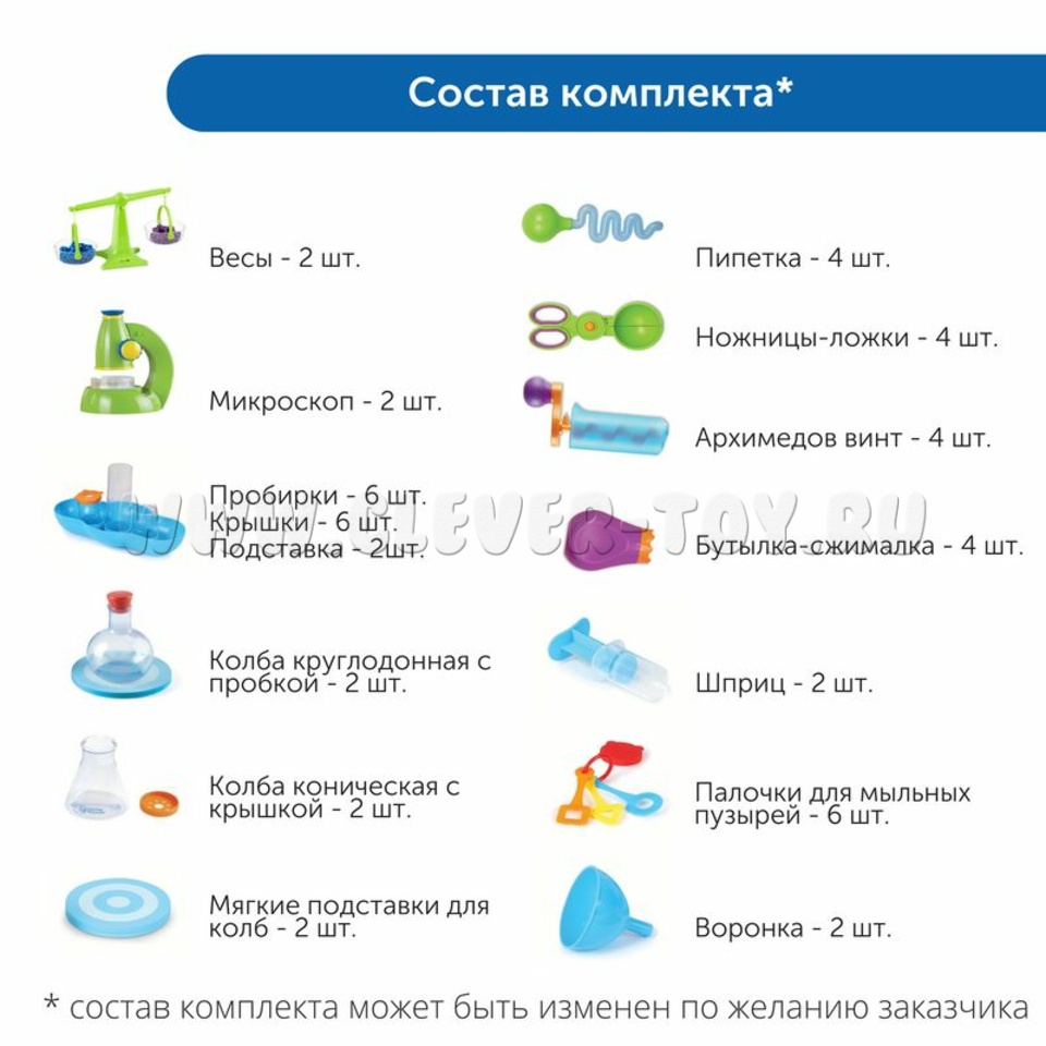 Комплект идеально подходит для экспериментирования с водой и исследовательской деятельности.