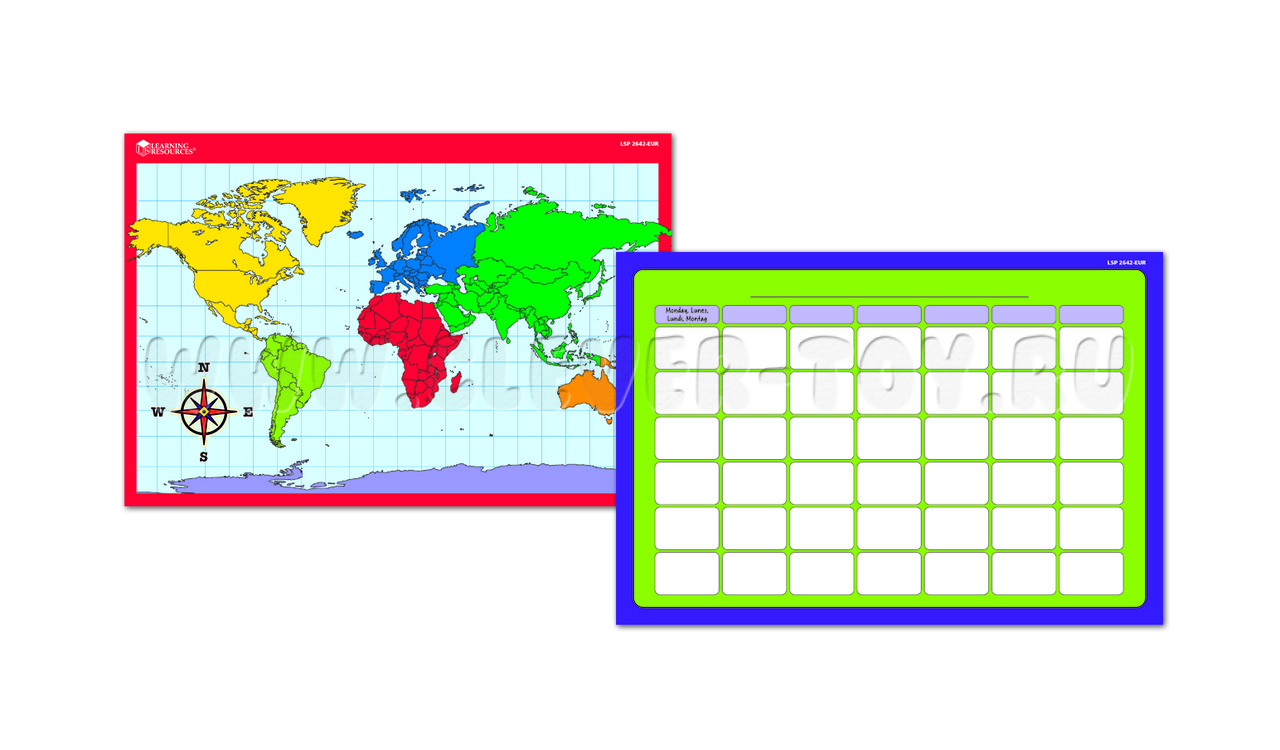• Складываемый уголок, состоящей из 3 частей (используется и для хранения элементов набора): маркерная доска, двусторонняя карта мира, двусторонний календарь;