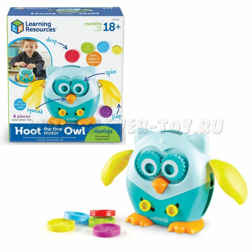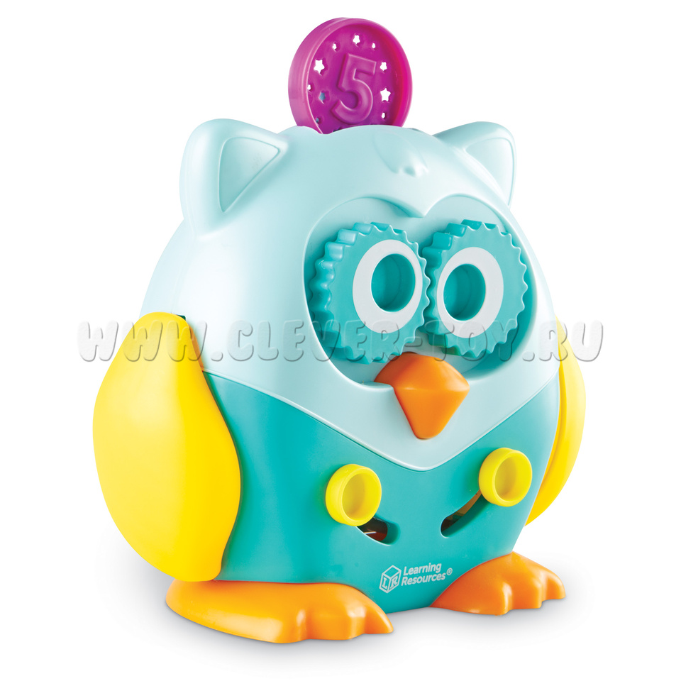 Игрушка способствует развитию мелкой моторики (монетки проталкиваются в отверстие на голове; крутящиеся шестеренки-глазки, клювик-пищалка), готовит детскую ручку к использованию ножниц (пальчиками сдвигаются тумблеры для поднятия крылышек, чтобы выкатывались монетки).