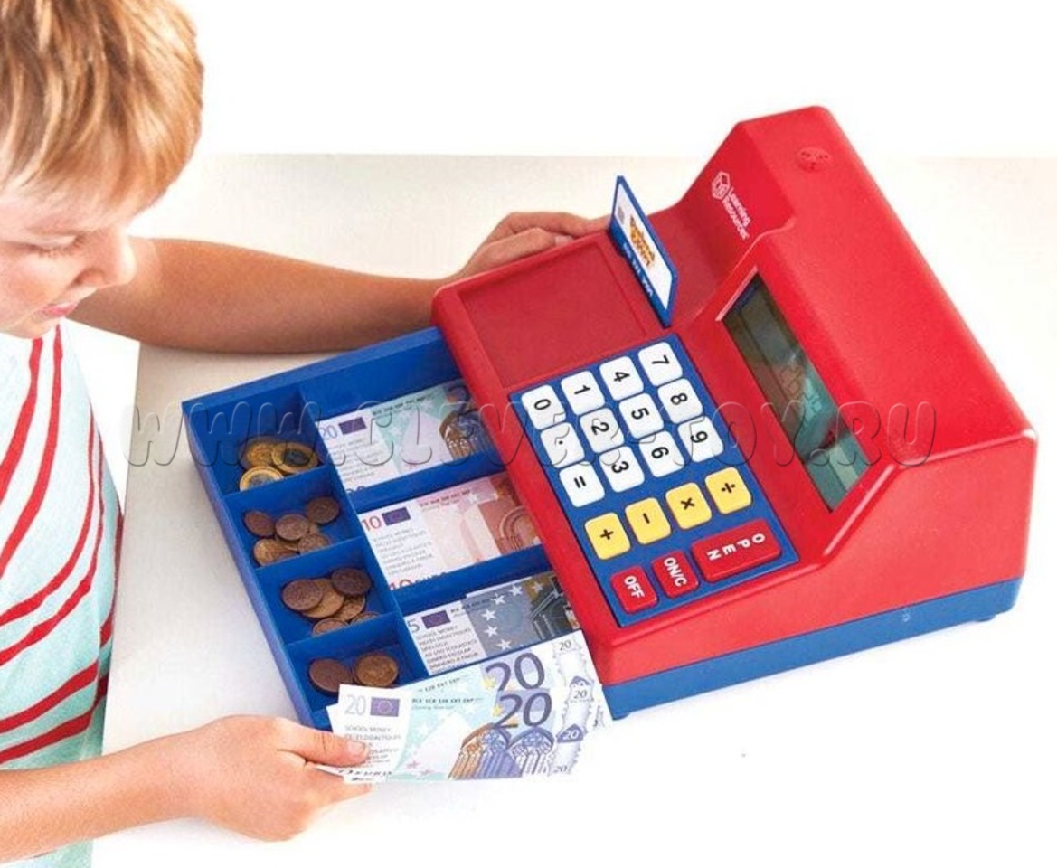 Игрушечный кассовый аппарат с рабочим денежным ящиком и калькуляторм на солнечной батарее.