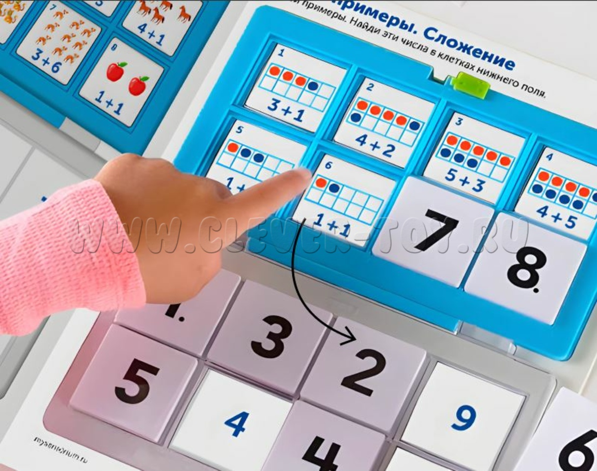 Принцип работы планшета заключается в сопоставлении вопросов и ответов. Разместите числовые плитки на правильных ответах, а затем проверьте себя - переверните планшет и сравните узор с образцом.